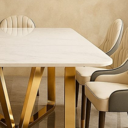 The mirror-polished golden frame is crafted with advanced PVD (Physical Vapor Deposition) coating, ensuring a long-lasting, tarnish-resistant shine that outperforms traditional lacquer finishes. Its geometric V-shaped legs provide both stability and a striking designer touch, making this dining table ideal for modern homes, luxury apartments, and stylish dining areas.